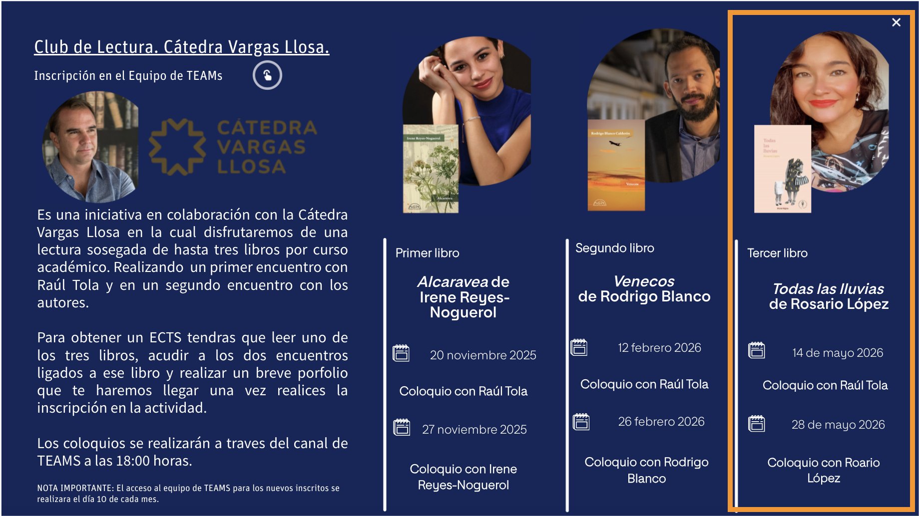 En esta ocasión, se leerá Todas las lluvias, de Rosario López. La primera sesión, conducida por Raúl Tola, tendrá lugar el 14 de mayo, y el 28 de mayo se celebrará el coloquio con la autora.